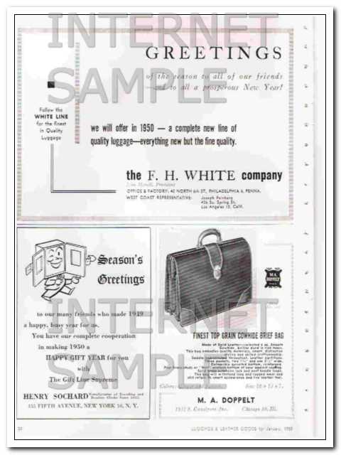 Original leather goods trade magazine vintage ad for THE LEATHER SPECIALTY COMPANY. Main office and factory was located at 1401 Central Parkway, Cincinnati, OH. Manufacturers of Smart Brief Cases. This unique 1950 old dated leather industry magazine advertisement would display wonderful matted and framed. Nice graphics. (Scan shows a slight pink tint that is not part of the actual ad). On the reverse side are fractional page ads for THE F. H. WHITE COMPANY, of Philadelphia, PA. Greetings of the Season to All of our Friends and to all A Prosperous New Year! HENRY SOCHARD of New York, NY. Season's Greetings to our many Friends who made 1949 a Happy, Busy Year for Us., and M. A. DOPPELT, INC, of Chicago, IL. Finest Top Grain Cowhide Brief Bag. Old leather and luggage advertisements. Approximate size 9 x 11 inches.