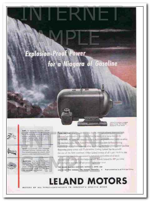 Original vintage industrial magazine ad, LELAND ELECTRIC COMPANY of Dayton, OH. Explosion Proof Power for a Niagara of Gasoline. Leland Polyphase Integral Horse Power Fan-Cooled Explosion Proof Motor. Old 1948 industry advertisement.