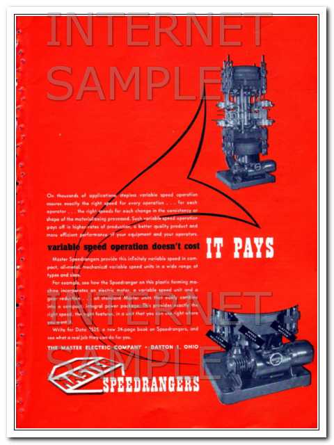 Original vintage industrial magazine ad, for MASTER ELECTRIC COMPANY of Dayton, OH. Speedrangers Variable Speed Operation Doesn't Cost It Pays. Thousands of applications for every operation. Pays off in more efficient performance of your equipment and your operators. Old 1948 industry advertisement.