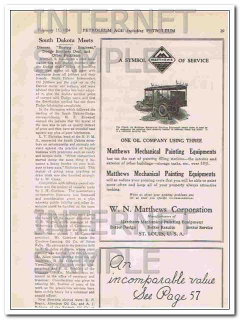 Original oil and gas trade magazine vintage ad for THE PETROLEUM IRON WORKS COMPANY of Sharon, PA. What Is Tank Satisfaction? Its knowing that the contents of your tanks are held safely from fire and evaporation. Unique 1924 old petroleum products storage industry gas station magazine advertisement. On the reverse side is a fractional page ad for the W. N. MATTHEWS CORPORATION of St. Louis, MO. A Symbol of Service. Matthews Mechanical Painting Equipment. Approximate size 9 x 12 inches.