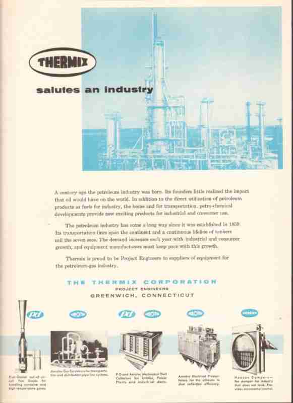 Original oil and gas trade magazine vintage ad for THE THERMIX CORPORATION, of Greenwich, CT. The Thermix Corp Salutes an Industry. Prat-Daniel Fan Stacks, Aerotec Gas Scrubbers, P-D and Aerotec Mechanical Dust Collectors for Utilities, Power Plants and industrial dusts, Aerotec Electrical Precipitators, Heacon Dampers. This unique 1959 old petroleum refinery equipment magazine advertisement would display fantastic matted and famed.