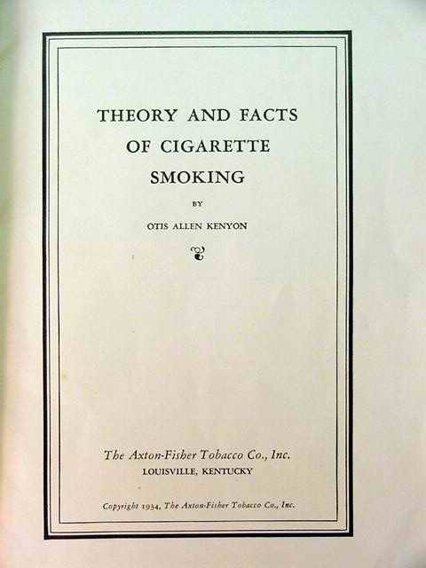 Soft covered book titled  THEORY AND FACTS OF CIGARETTE SMOKING  by Otis Allen Kenyon, The Axton-Fisher Tobacco Co., Inc., Louisville, Kentucky, 1934, 29 pages.