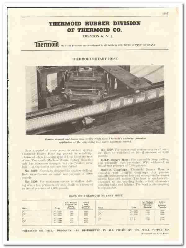 Products include Thermoid Rotary Hose, Steam Hose, Flexible Slush Pump Discharge Hose, Slush Pump Intake Hose, Hydraulic Control Hose, Air Hose, Air Drill Hose, Water Hose, Welding Hose, Flue Rattler Hose, Suction Hose, Oil Suction & Discharge Hose, Fuel Oil Hose, Gasoline Pump Hose, Tank Truck Hose, Tank Car Unloading Hose, Multiple-V Belts, Oil Country Belting, Woven Brake Lining, Compressed Asbestos Sheet Packing and Thermoid Stuffing-Box Rings are all fully featured.
