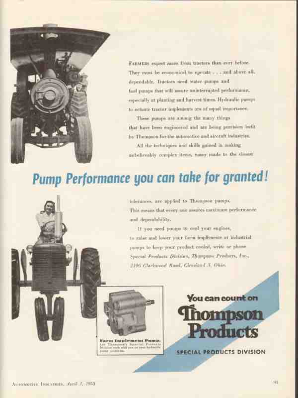Original vintage automotive industries trade magazine ad for THOMPSON PRODUCTS, INC. of Cleveland, OH. Pump Performance You Can Take For Granted! Farm Tractor Implement Pumps. Old