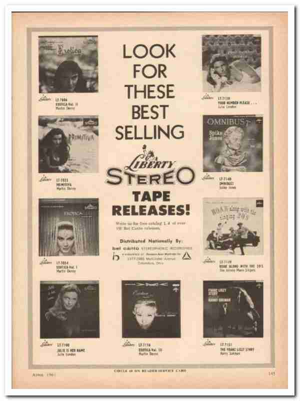 Original vintage ad for THOMPSON RAMO WOOLDRIDGE INC. Liberty Stereo tapes distributed by bel canto Stereophonic Recordings. Martin Denny, Julie London, Spike Jones, Harry Sukman, and The Johnny Mann Singers albums are pictured.
