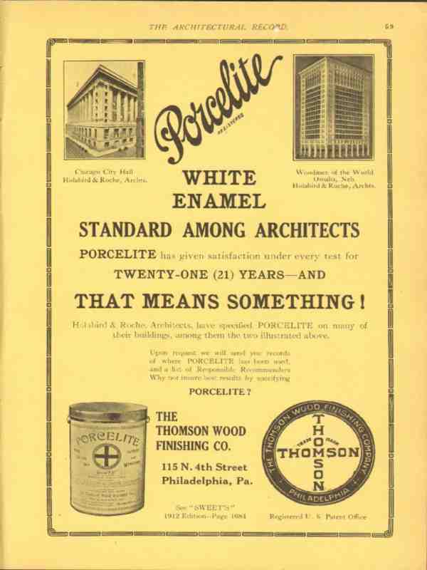 Original vintage architectural trade magazine ad for THE THOMSON WOOD FINISHING COMPANY of Philadelphia, PA. Porcelite White Enamel, Standard Among Architects. Used at the Chicago City Hall and the Woodmen of the World in Omaha, NE. Holabird and Roche, Architects. Old 1912 construction industry advertisement.