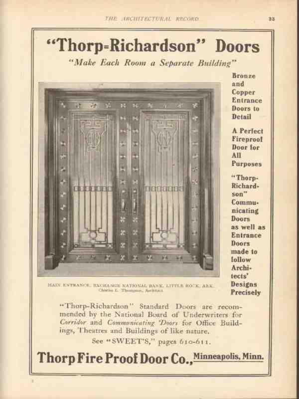 Original vintage architectural trade magazine ad for THORP FIRE PROOF DOOR COMPANY of Minneapolis, MN. Thorp Richardson Doors on the Main Entrance of the Exchange National Bank in Little Rock, Arkansas. Bronze and Copper Doors to Detail, a Perfect Fireproof Door for All Purposes. Old 1912 building construction industry advertisement.