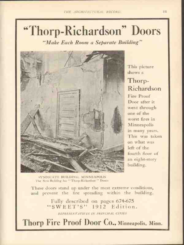 Original vintage architectural trade magazine ad for THORP FIRE PROOF DOOR COMPANY of Minneapolis, MN. Syndicate Building in Minneapolis with Thorp-Richardson Fire Proof Door on what was left of the fourth floor of an eight story building. Old 1912 construction industry materials advertisement.