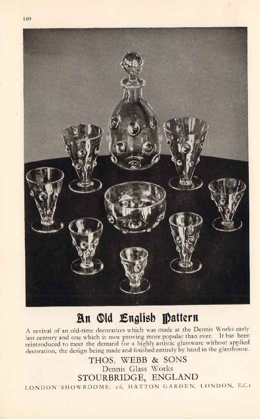 Original glass vintage ad for THOS. WEBB AND SONS LTD. Old English Pattern made at Dennis Glass Works. A revival of an old-time decoration which was made early last century and one which is now proving more popular than ever. Meets the demand for a highly artistic glassware without applied decoration, the design being made and finished entirely by hand in the glasshouse.