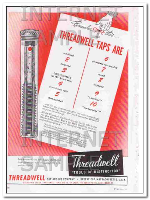 Original vintage industrial magazine ad, for THREADWELL TAP AND DIE COMPANY of Greenfield, MA. Tools of distinction. Threadwell taps are machined, hardened, tested, inspected. Sold exclusively by Mill Supply distributors. Old 1948 industry advertisement.