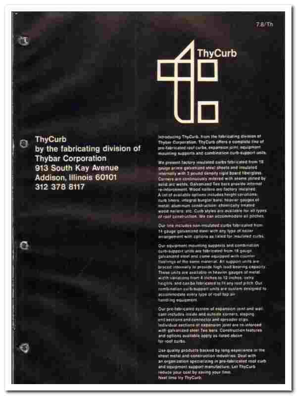 Original 1977 roofing trade vintage catalog for the THYBAR CORPORATION. (ThyCurb Division). Main office and plant were located at 913 South Kay Avenue, Addison, IL.