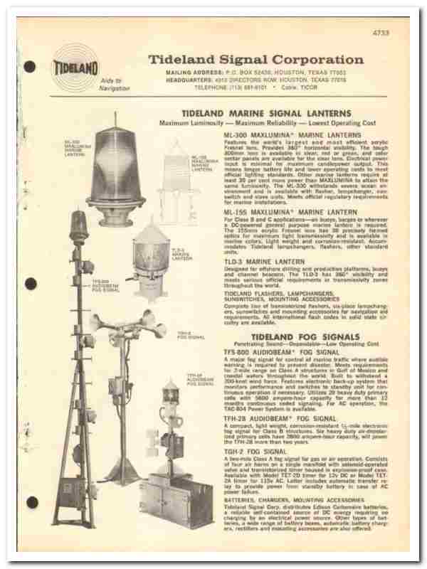 Products include the Tideland Marine Signal Lanterns, Tideland Fog Signals, Tideland's Navalert Monitors Marine Signals and Underwater Acoustic Systems, all are fully featured.