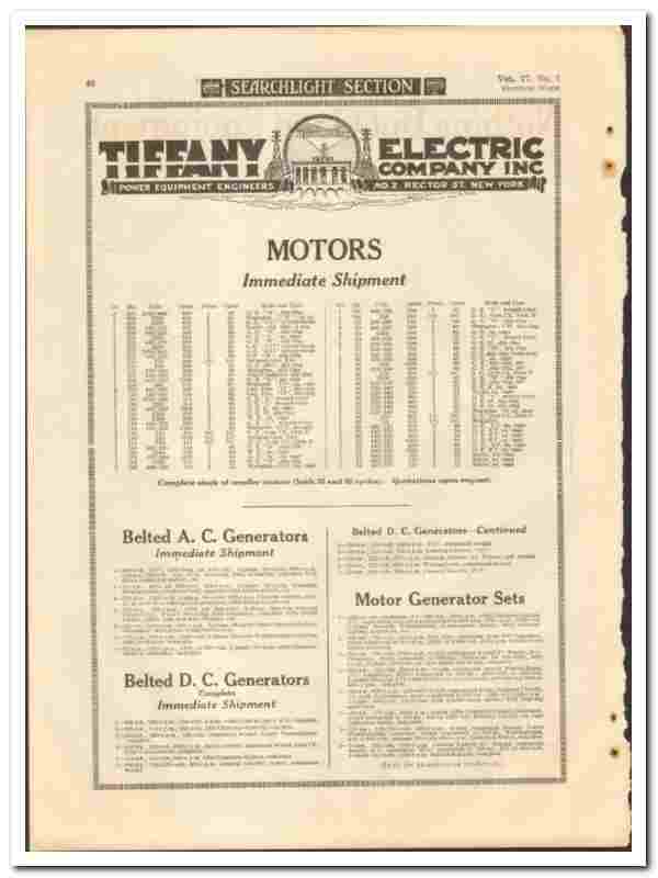 Tiffany Electric Company 1921 vintage ad motors belted generators sets