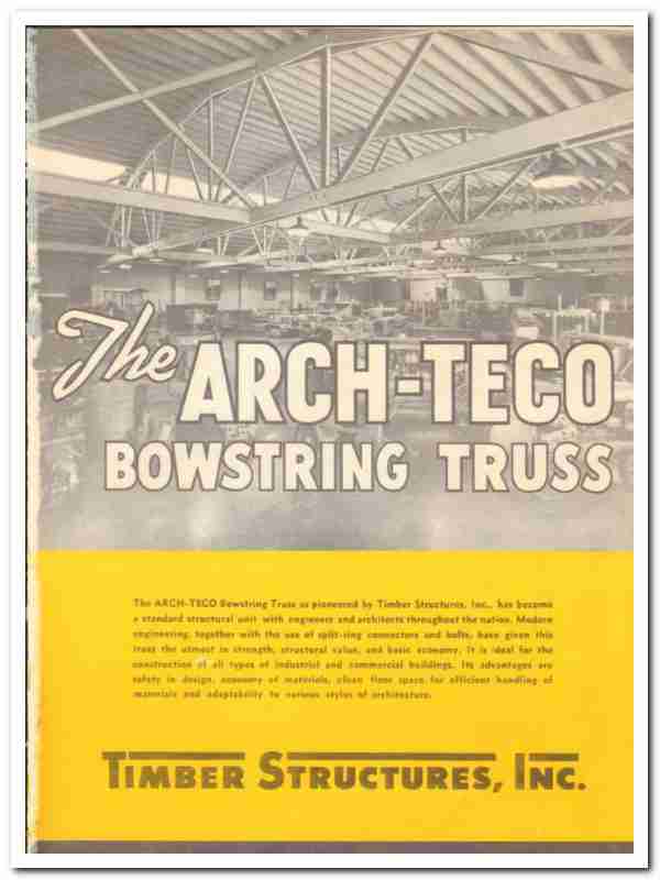 The Arch-Teco Bowstring Truss as pioneered by Timber Structures, Inc, has become a standard structural unit with engineers and architects throughout the nation. Modern engineering, together with the use of split-ring connectors and bolts, have given this truss the utmost in strength, structural value, and basic economy. It is ideal for the construction of all types of industrial and commercial buildings. Its advantages are safety in design, economy of materials, clean floor space for efficient handling of materials and adaptability to various styles of architecture.
