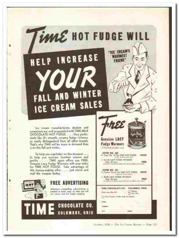 Time Chocolate Company 1938 vintage ice cream ad hot fudge warmer