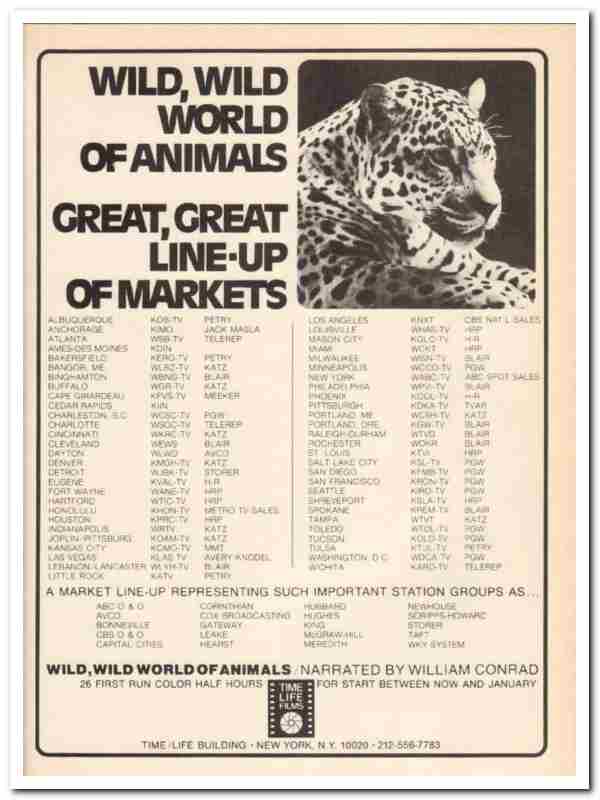 Original media vintage magazine ad for TIME LIFE FILMS. Wild World of Animals narrated by William Conrad on great line-up of markets.