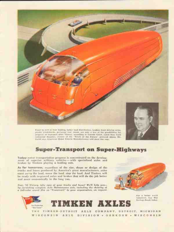Original World War 2 future truck industry trade magazine vintage ad for TIMKEN DETROIT AXLE COMPANY of Detroit, MI. Super Transport on Super Highways according to Lurelle Guild, noted New York Industrial Designer, creator of the Truck of the Future. Old 1943 WW2 wartime era propaganda magazine advertisement.