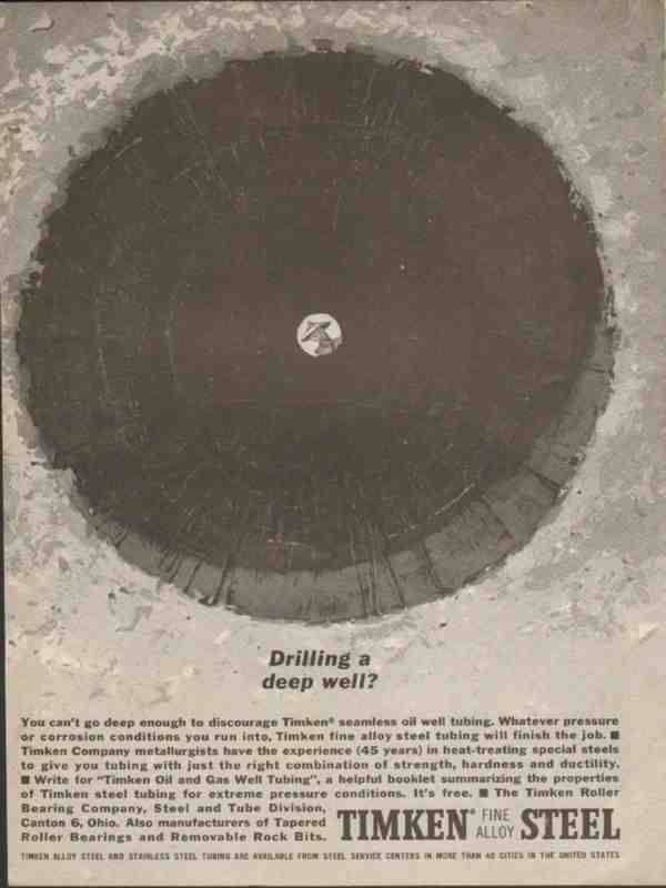 Original oil and gas trade magazine vintage ad for TIMKEN ROLLER BEARING COMPANY, of Canton, OH. Drilling a Deep Well? You can't go deep enough to discourage Timken seamless oil well tubing. This unique 1962 old oilfield petroleum drilling pipe equipment industry magazine advertisement would display beautifully matted and framed.