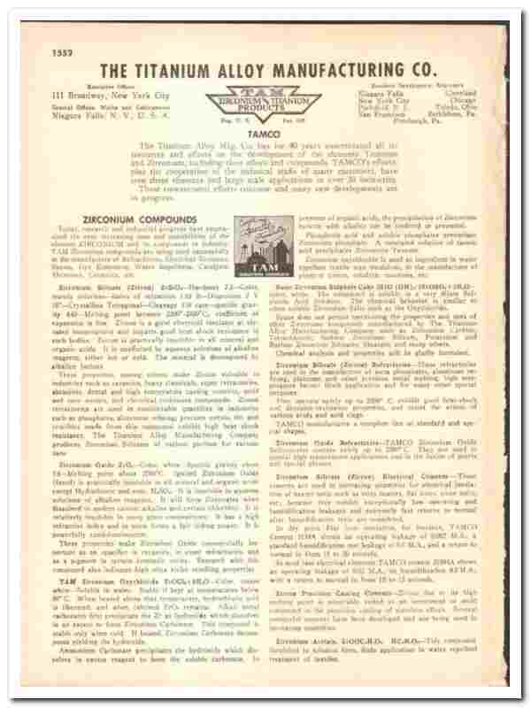 'The Titanium Alloy Manufacturing Company has for 40 years concentrated all of its resources and efforts on the development of the elements Titanium and Zirconium, including their alloys and compounds. TAMCO's efforts, plus the cooperation of the technical staffs of many customers, have seen these elements find large scale applications in over 30 industries. These concentrated efforts continue and many new developments are in progress'.