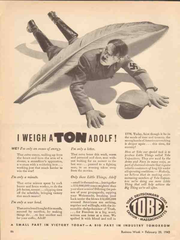 tobe deutschmann corp 1943 weigh a ton adolf ww2 capacitor vintage ad