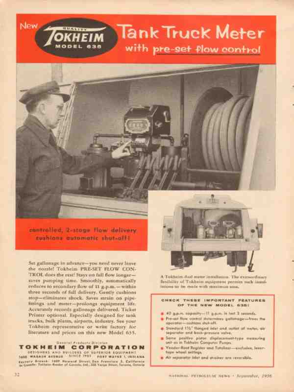 Original old petroleum oil delivery trade magazine vintage ad for TOKHEIM CORPORATION of Ft. Wayne, IN. Tank Truck Meter with Pre-Set Flow Control. Model 635 cushions automatic shut-off. This unique old 1956 oil and gas advertisement would display beautifully matted and framed.