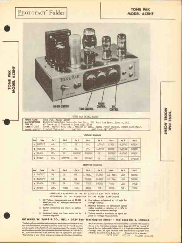 Vintage TONE PAK model AC8HF 4 tube 3 channel audio amplifier. Original old Sams Photofact manual includes schematics, layouts, voltage & resistance readings, parts list. 4 pages. Dated 1947. Electro-Technical Laboratories Inc. of Leonia, NJ. This manual would make a sensational accompaniment to your vintage audio equipment.