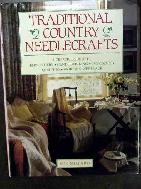 Hard covered book titled TRADITIONAL COUNTRY NEEDLECRAFTS, A CREATIVE GUIDE TO EMBROIDERY, CANDLEWICKING, SMOCKING, QUILTING AND WORKING WITH LACE by Sue Millard, Photography by Derek Williams, Illustrations by Jane Fenemore, 160 pages. 1995. All aspects of working with traditional techniques and fabrics are covered in this superbly photographed book. The first section covers embroidery, candlewicking, smocking and quilting. Techniques and stitches are described and illustrated simply and clearly. Useful hints and notes are given, and there is a special section on working with antique and modern lace. In the second section step by step instructions and detailed diagrams are provided for over 50 projects for the bedroom, bathroom, nursery and living room. In addition , there are numerous delightful decorative and charming gifts to make and give. Patterns and templates are included in the final section. This book is in VG condition. Pages are clean and intact, and the binding is tight.