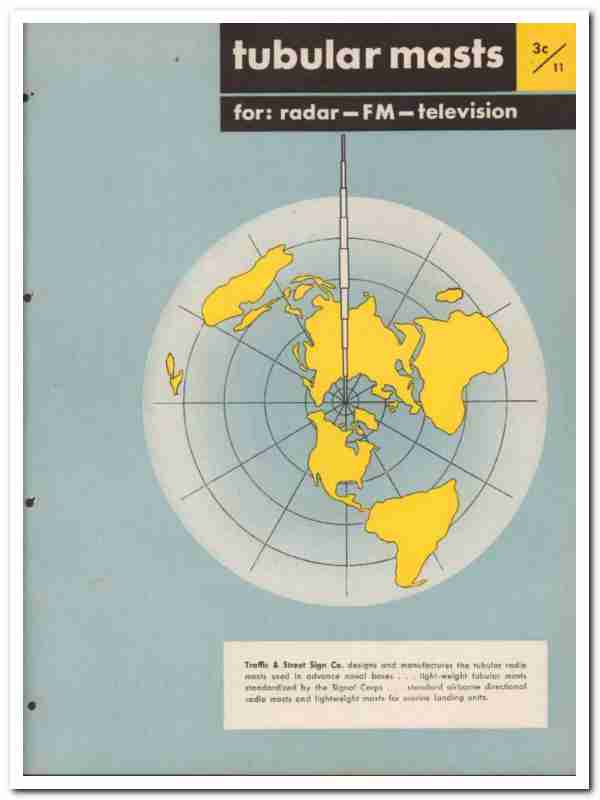 Original electrical trade vintage catalog for TRAFFIC & STREET SIGN COMPANY. Main office and plant was located at 68 Foundry Street, Newark, NJ. Established 1902. Traffic & Street Sign Company designed and manufactured the tubular radio masts used in advance naval bases. Manufacturers of Tubular Masts, permanent and portable. Products for Radar, FM and Television. Has numerous product images with detailed descriptions, uses, applications, dimensions and specifications provided. Unbound from a large wartime 1945 engineering designer catalog, this unique old four page technical brochure would display beautifully matted and framed. Awesome cover graphics. A fantastic addition to your vintage electrical equipment library.