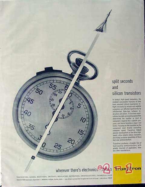 Original vintage magazine ad, TRANSITRON ELECTRONIC CORPORATION, of Wakefield, MA. Split seconds and Silicon Transistors. Old 1961 industrial advertisement.