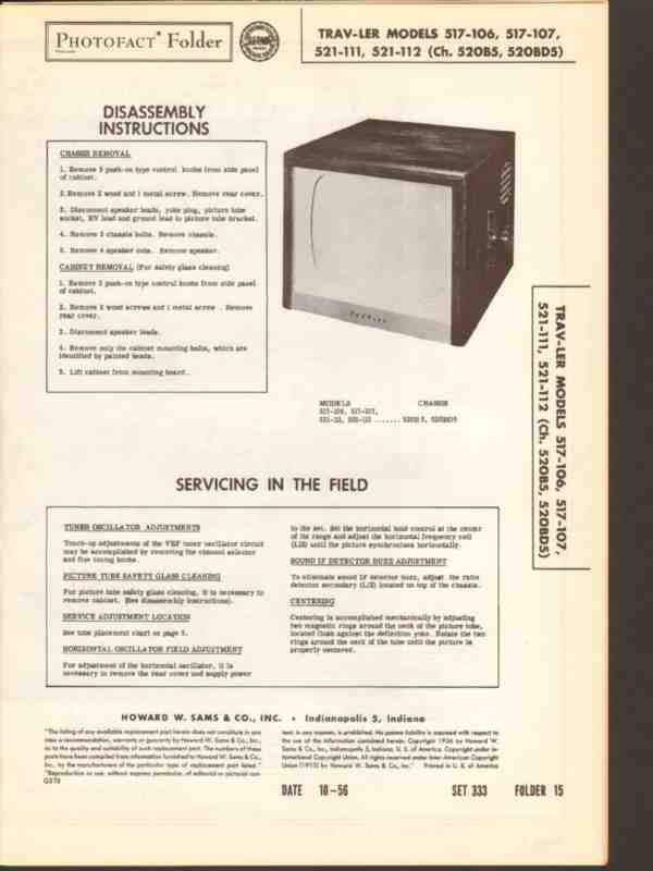 trav-ler model 517-10x 521-11x tv television sams photofact manual