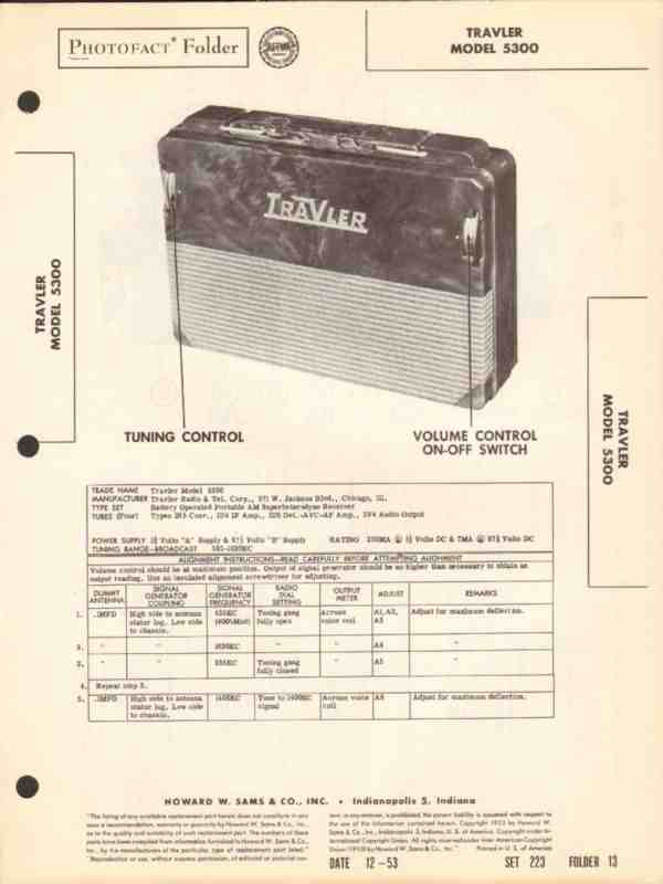 Vintage TRAVLER model 5300 4 tube Superheterodyne AM radio receiver.Original old Sams Photofact manual includes schematic, layout, alignment instructions, voltage & resistance test chart, repair parts list. 4 pages. Dated 1953. Trav-Ler Radio & Television Corp. of Chicago, IL.
