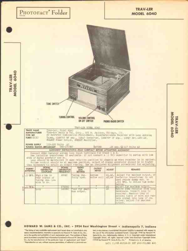 Vintage TRAV-LER model 6040 6 tube Superheterodyne AM radio receiver with phonograph record player. Original old Sams Photofact manual includes schematic, layout, alignment info, repair parts list. 4 pages. Dated 1948. Trav-Ler Radio & Television Corp. of Chicago, IL. This manual would make a sensational accompaniment to your vintage audio equipment.