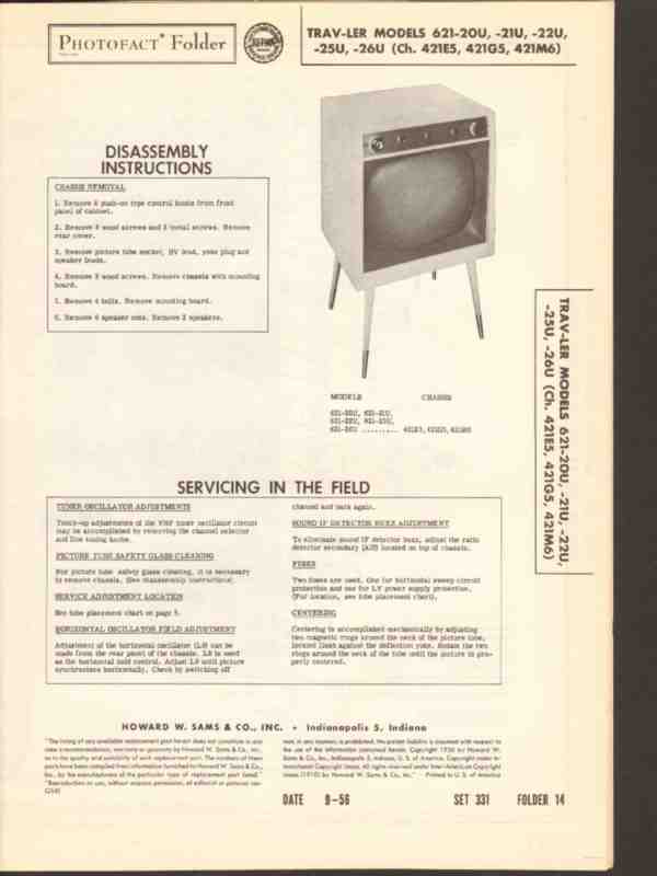 Vintage TRAV-LER models 621-20U, 621-21U, 621-22U, 621-25U and 621-26U (Ch. 421E5, 421G5 and 421M6) 21 tube TV television receiver. Original old Sams Photofact manual includes schematic, layout, alignment instructions, voltage & resistance test chart, repair parts list and description. 16 pages. Dated 1956. TravLer Radio & Television Corp. of Chicago, IL. This manual would make a sensational accompaniment to your classic video TV equipment.