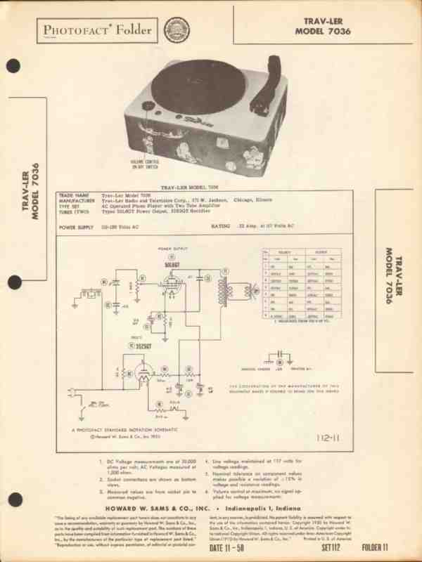 Vintage TRAV-LER model 7036 2 tube amplified phonograph record player. Original old Sams Photofact manual includes schematic, layout, repair parts list. 2 pages. Dated 1950. Trav-Ler Radio & Television Corp. of Chicago, IL.