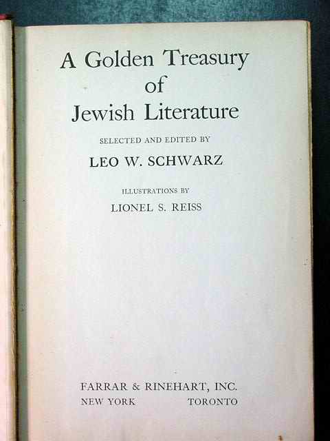 Hard covered book titled  A GOLDEN TREASURY OF JEWISH LITERATURE  Selected and Edited by Leo Schwarz, Illustrations by Lionell Reiss, 1937, 818 pages.