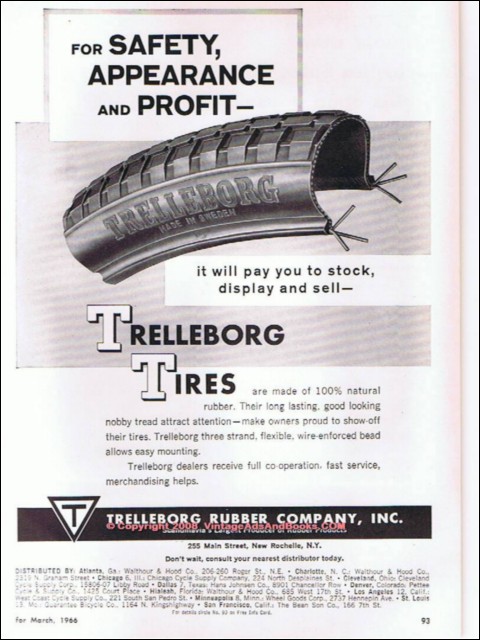 Original vintage magazine ad, TRELLEBORG RUBBER COMPANY, INC. of New Rochell, NY. For Safety, Appearance and Profit it will pay you to stock, display and sell Trelleborg Tires. Bike tires of 100% natural rubber. Old 1966 dated bicycle industry advertisement. Would look sensational matted and framed.