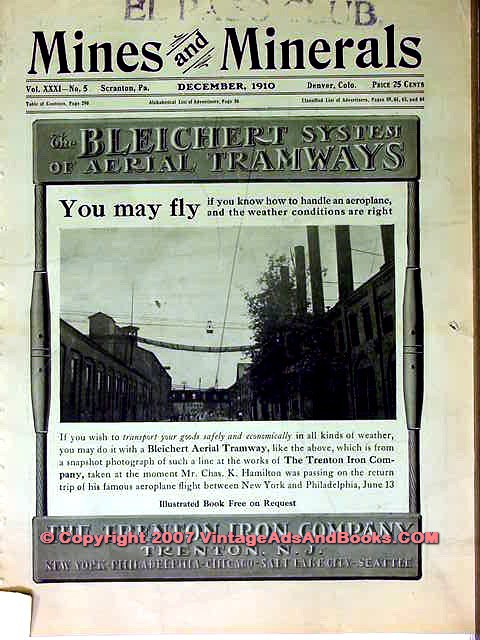 Original vintage mining magazine ad for TRENTON IRON COMPANY of Trenton, NJ. The Bleichert System of Aerial Tramways is pictured at the works of The Trenton Iron Company, with the photograph taken at the moment Mr. Charles K. Hamilton was passing on the return trip of his famous aeroplane flight between New York and Philadelphia, June 13, 1910. Old 1910 coal mining equipment industry advertisement. There is a faded El Paso Club written at the top of the page. Would display beautifully matted and framed!