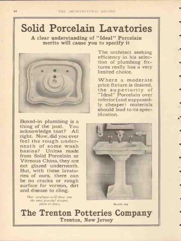 Original vintage architectural trade magazine ad for THE TRENTON POTTERIES COMPANY of Trenton, NJ. Solid Porcelain Lavatories. A clear understanding of Ideal Porcelain merits will cause you to specify it. Bathroom sinks, toilets. Old 1912 plumbing fixtures advertisement.