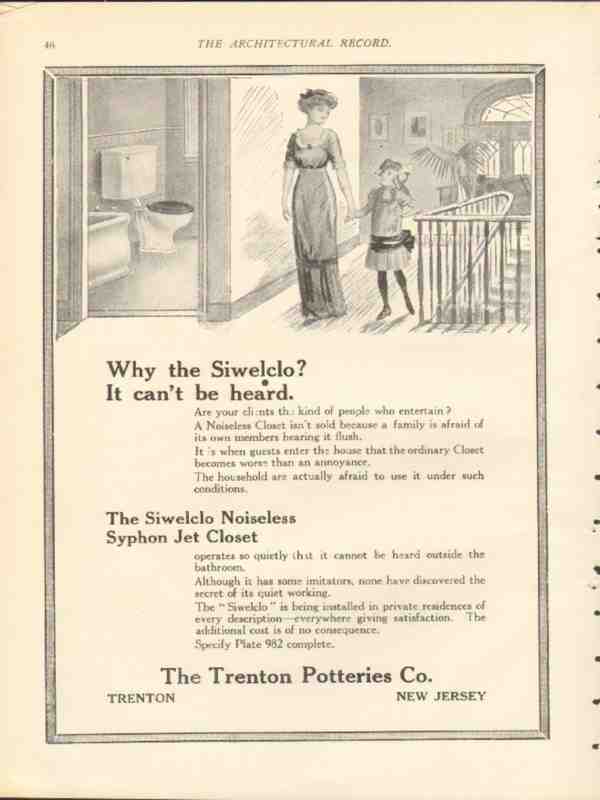 Original vintage architectural trade magazine ad for THE TRENTON POTTERIES COMPANY of Trenton, NJ. Why the Siwelclo? It Can't be Heard. The Siwelclo Noiseless Syphon Jet Closet. Old 1912 antique toilet and plumbing advertisement.