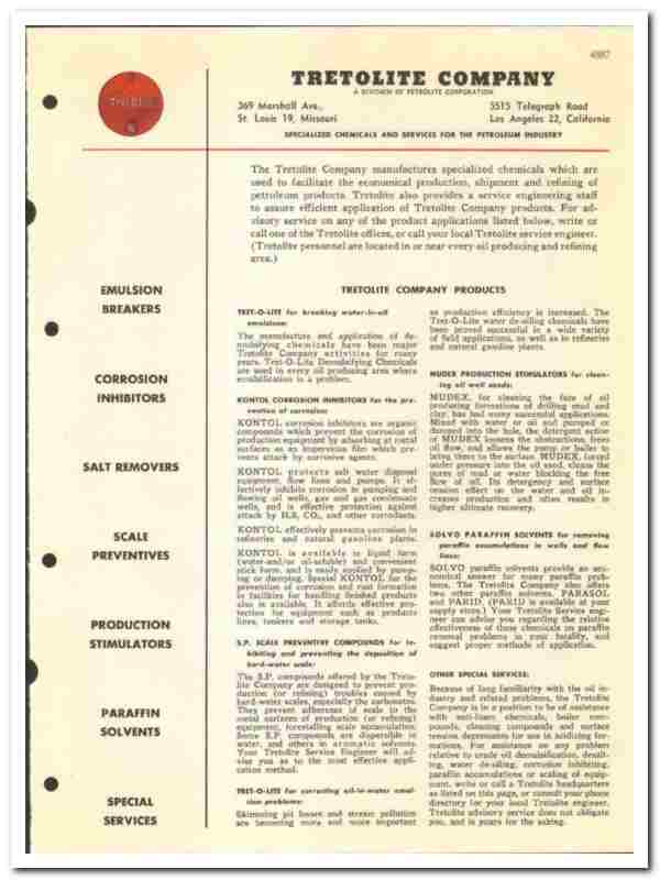 Original 1954 Oil and Gas trade vintage catalog for the TRETOLITE COMPANY. (Division of Petrolite Corp). Main office and plant were located at 369 Marshall Avenue, St Louis, MO. and at 5515 Telegraph Road, Los Angeles, CA.