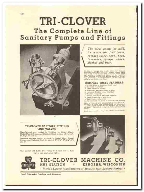Original 1942 industrial food production trade vintage catalog for the TRI-CLOVER MACHINE COMPANY. Main office and plant was located at Hub Station, Kenosha, WI.