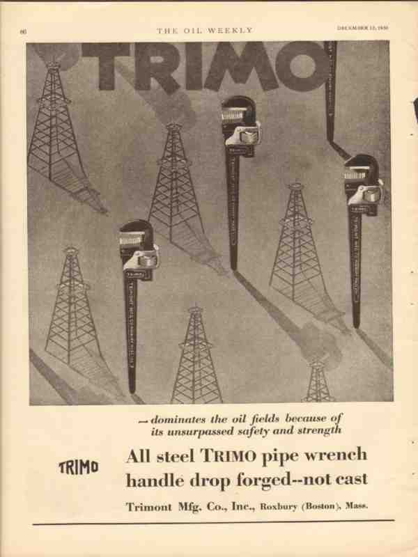 Original oil and gas oilfield drilling industry trade magazine vintage ad for TRIMONT MANUFACTURING COMPANY, INC. of Roxbury, MA. Trimo Pipe Wrench Dominates the Oil Fields Because of Its Unsurpassed Safety and Strength. Handle Drop Forged, Not Cast. Old 1930 petroleum tools magazine advertisement.