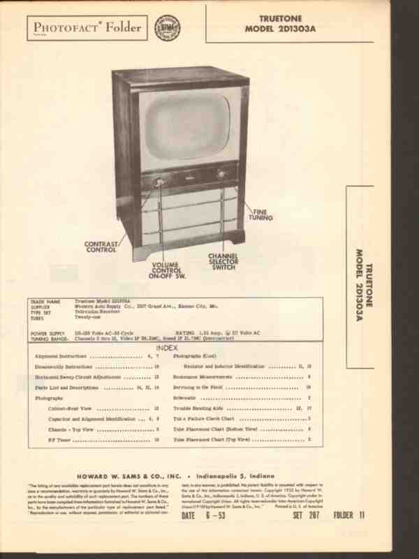 Vintage TRUETONE model 2D1303A 21 tube TV television receiver. Original old Sams Photofact manual includes schematic, layout, alignment instructions, voltage & resistance test chart, repair parts list. 18 pages. Dated 1953. Western Auto Supply Company of Kansas City, MO. This manual would make a sensational accompaniment to your classic video TV equipment.