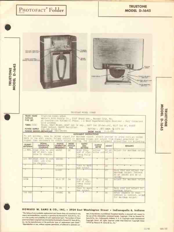 Vintage TRUETONE model D1645 Superheterodyne 6 tube AM SW radio receiver with automatic phonograph record changer player. Original old Sams Photofact manual includes schematic, layout, alignment instructions, voltage & resistance test charts, repair parts list and description. Dated 1946. 4 pages. Western Auto Supply Company of Kansas City, MO. This manual would make a sensational accompaniment to your classic retro radio / phono equipment.