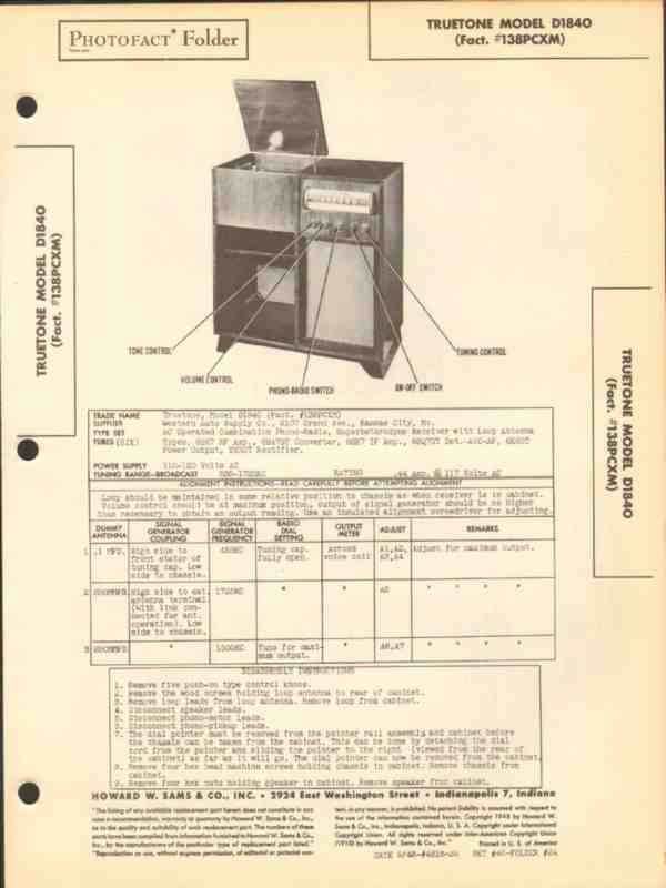 Vintage TRUETONE model D1840 (Fact. # 138PCXM) Superheterodyne AM radio receiver phonograph. Original old Sams Photofact manual includes schematics, layouts, alignment adjustments, repair parts list. 4 pages. Dated 1948. Western Auto Supply Company of Kansas City, KS. This manual would make a sensational accompaniment to your vintage audio equipment.