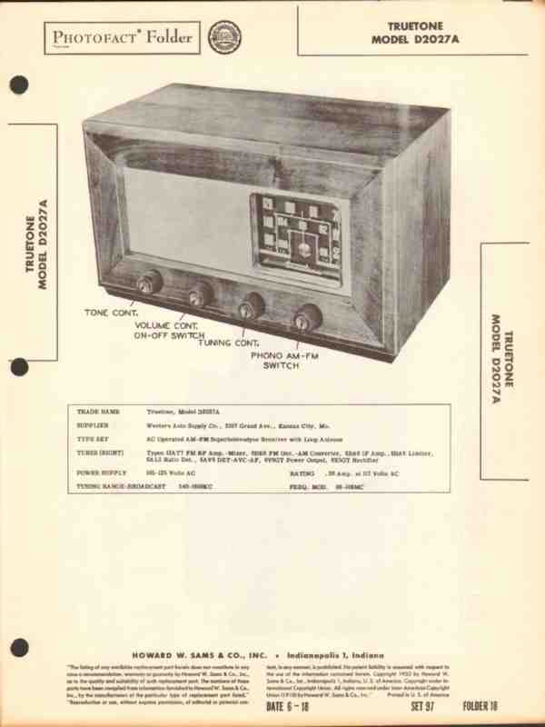 Vintage TRUETONE model D2027A 8 tube Superheterodyne AM FM radio receiver. Original old Sams Photofact manual includes schematic, layouts, alignment info, voltage test charts, repair parts list. 7 pages. Dated 1950. Western Auto Supply Company of Kansas City, KS. This manual would make a sensational accompaniment to your vintage audio equipment.