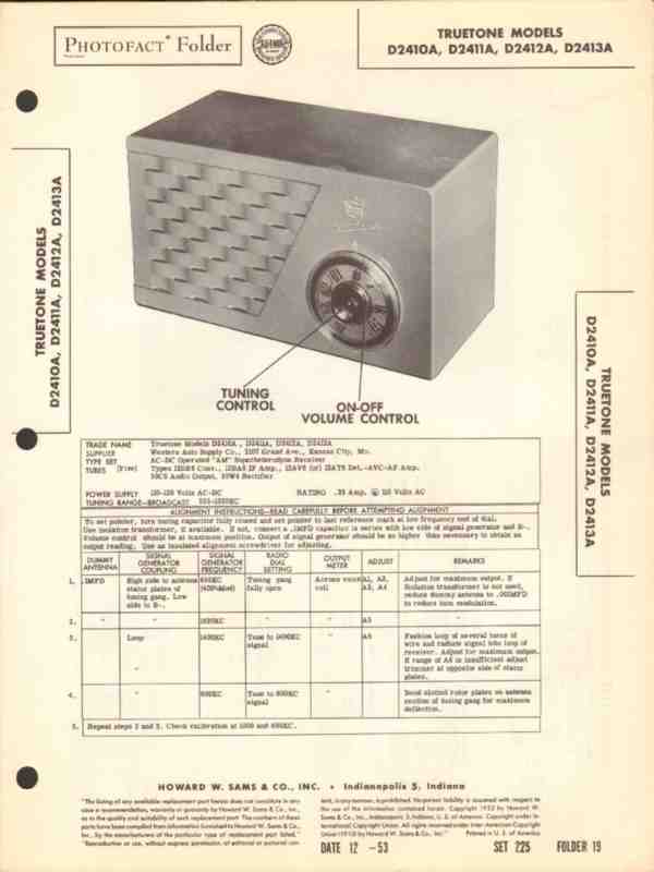 Vintage TRUETONE models D2410A, D2411A, D2412A and D2413A 5 tube Superheterodyne AM radio receiver. Original old Sams Photofact manual includes schematic, layout, alignment instructions, voltage & resistance test chart, repair parts list. 4 pages. Dated 1953. Sears, Roebuck & Company of Chicago, IL. This manual would make a sensational accompaniment to your classic radio equipment.
