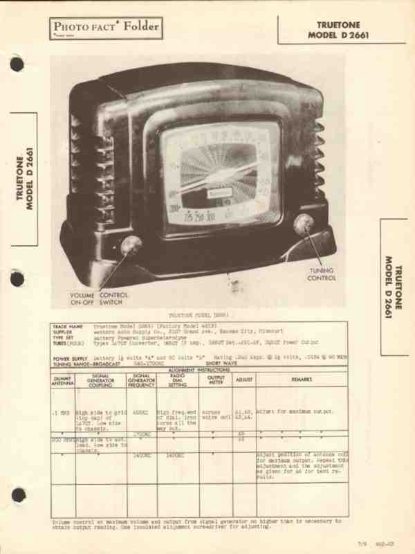 Vintage TRUETONE model D2661 (Factory model 4B19) Superheterodyne 4 tube AM radio receiver. Original old Sams Photofact manual includes schematic, layout, alignment instructions, voltage & resistance test charts, repair parts list and description. Dated 1946. 4 pages. Western Auto Supply Company of Kansas City, MO. This manual would make a sensational accompaniment to your classic retro radio equipment.