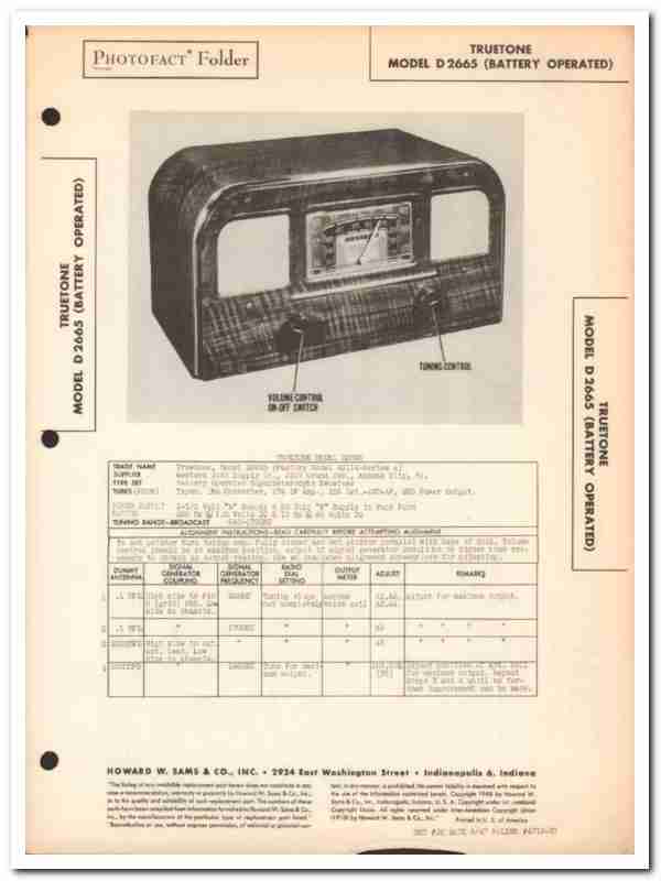 Vintage Radio Service Manual - TRUETONE model D2665 battery operated 4-tube Superheterdyne AM radio receiver. Manufactured by Western Auto Supply Company, of Kansas City, MO. Dated 1947. 4 pages. Original old Sams Photofact manual includes schematic, layout, alignment instructions, voltage & resistance test chart, repair parts list and description. This manual would make a sensational accompaniment to your retro audio equipment.