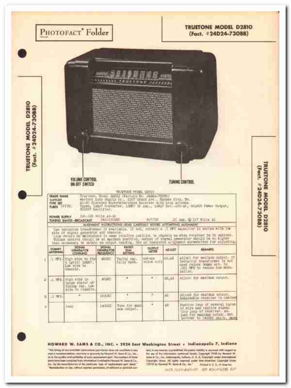 Vintage Radio Service Manual - TRUETONE model D2810 (Factory No. 24D24-730BB) 5-tube Superheterodyne AM radio receiver. Manufactured by Western Auto Supply Company, of Kansas City, MO. Dated 1948. 4 pages. Original old Sams Photofact manual includes schematic, layout, alignment instructions, dial cord drive, voltage & resistance test chart, repair parts list and description. This manual would make a sensational accompaniment to your retro audio equipment.